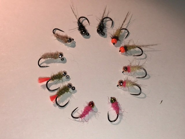 My top secret half dozen grayling nymphsThese nymphs are from 12 o’clock the ace of spades nymph. On an incurve 124 barbless size 14 with a 4.3 mm slotted plain nickel black bead. Not only designed to get to the river bed quickly it does an excellent job of imitating the dark stoneflies and takes many grayling as a point fly. Orange beaded olive nymph. This is a florescent orange tungsten bead and on salmon rivers I’m certain this gets taken as an egg. Tied on a heavyweight Maruto 14 (a great holding pattern used for the now World famous Soft Hackle Dry Fly) it is a great dropper nymph. The raspberry ripple nymph at 3 o’clock is tied with a 3mm slotted copper faceted bead on a HW Maruto 14. This nymph has been responsible for my largest grayling in 2019 a 2 lb 12 ounce 51cm specimen on hard fished water. The rainbow pinkie nymph imitates “pinkie” maggots used by bait anglers. Tied on a 3mm rainbow tungsten bead and unashamedly shocking pink. Pink is a kill or cure colour for grayling and therefore will illicit either an aggressive response or leave every grayling in the pool bolting in terror. I have had many double figure sessions with grayling taking this nymph exclusively. The olive red tag is tied on a 3mm tungsten slotted silver diamond faceted bead and a size 14 B124. Red tags are a classic for attracting grayling and this nymph is no different. Finally another classic is the silver beaded killer bug. On a 3.8 mm diamond faceted silver bead, size14 120 and tied with the original killer bug yarn. This is the perfect small dense cased caddis pattern and is a great catching point fly. To purchase these superb dozen nymphs for £20 plus £2.50 p and p just e-mail me with grayling special in the subject and I’ll invoice you.