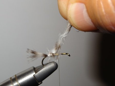 Pull the waste stalks to the eye of the hook and tie of very firmly with many turns of thread. This prevents the CdC feathers being removed by trout teeth.