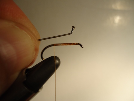 Mount a Kamasan B175 hook in the vice after removing the barb and catch in the thread.